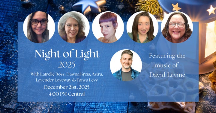 I’ll be co-hosting Night of Light 2025 on December 21st at 4:00 PM Central, alongside a beautiful circle of women — Dawna Kreis, Astra, Lavender Loveway, Tanya Levy — and featuring live music from the incredible David Levine.